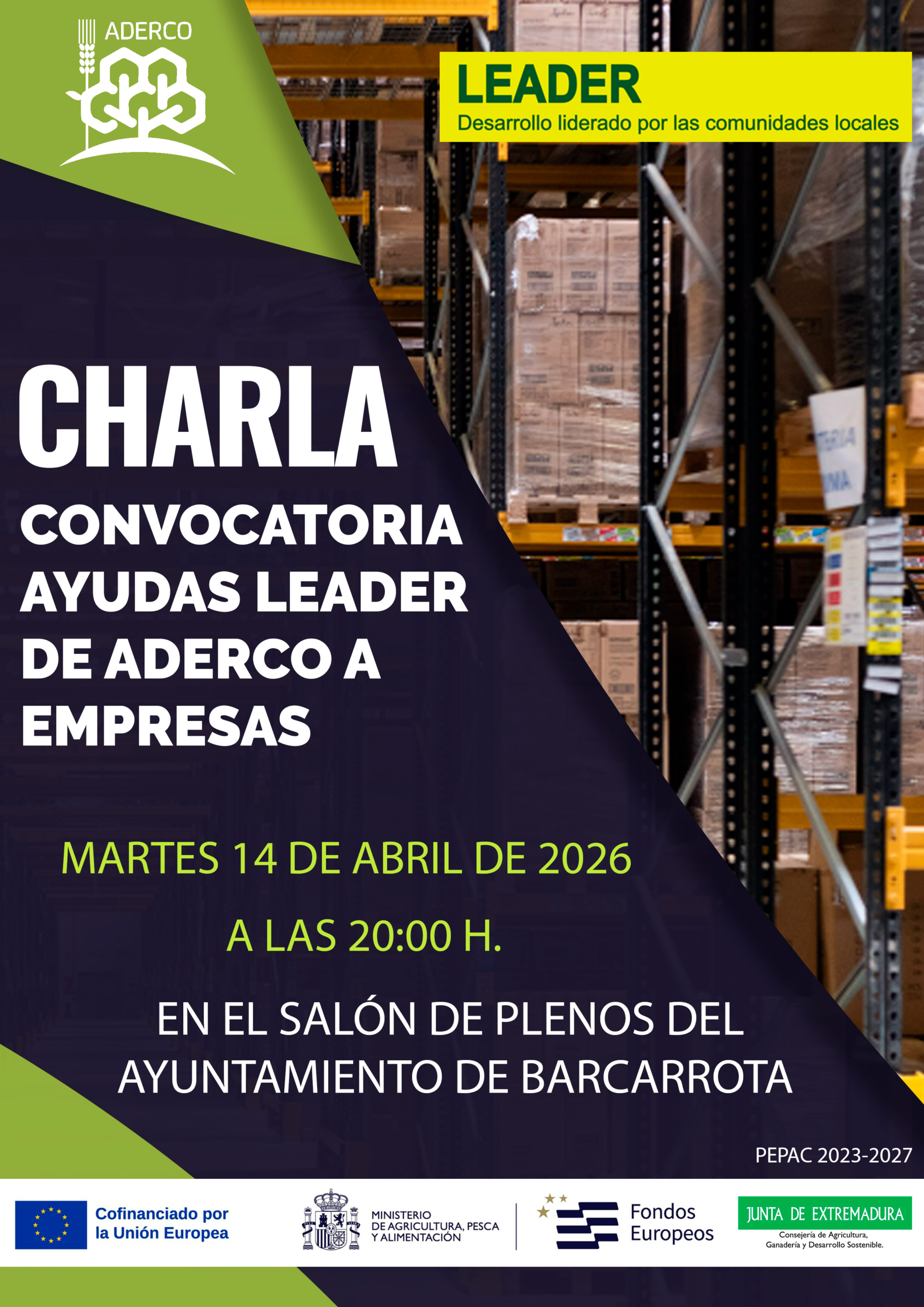 El próximo martes, 14 de abril, a las 20:00 h, en el Salón de Plenos del Ayuntamiento de Barcarrota, ADERCO impartirá una charla sobre las ayudas del programa Leader en la Comarca de Olivenza. Esta sesión estará dirigida tanto a empresas como a emprendedores y emprendedoras o cualquier persona interesada en acometer un proyecto de creación o modernización empresarial en áreas como la industria, los servicios o el turismo, entre otros. Recientemente se acaba de abrir una convocatoria de ayudas que permanecerá abierta hasta el 30 de Junio. Se trata de ayudas a la inversión que contempla elementos como instalaciones, mobiliario, maquinaria, obras menores, etc, y que tiene una dotación global de 1.200.000 euros, siendo una gran oportunidad, según la presidenta de ADERCO, Beatriz González, y el alcalde de la localidad, Miguel Rodríguez, para el impulso de las empresas en la comarca.